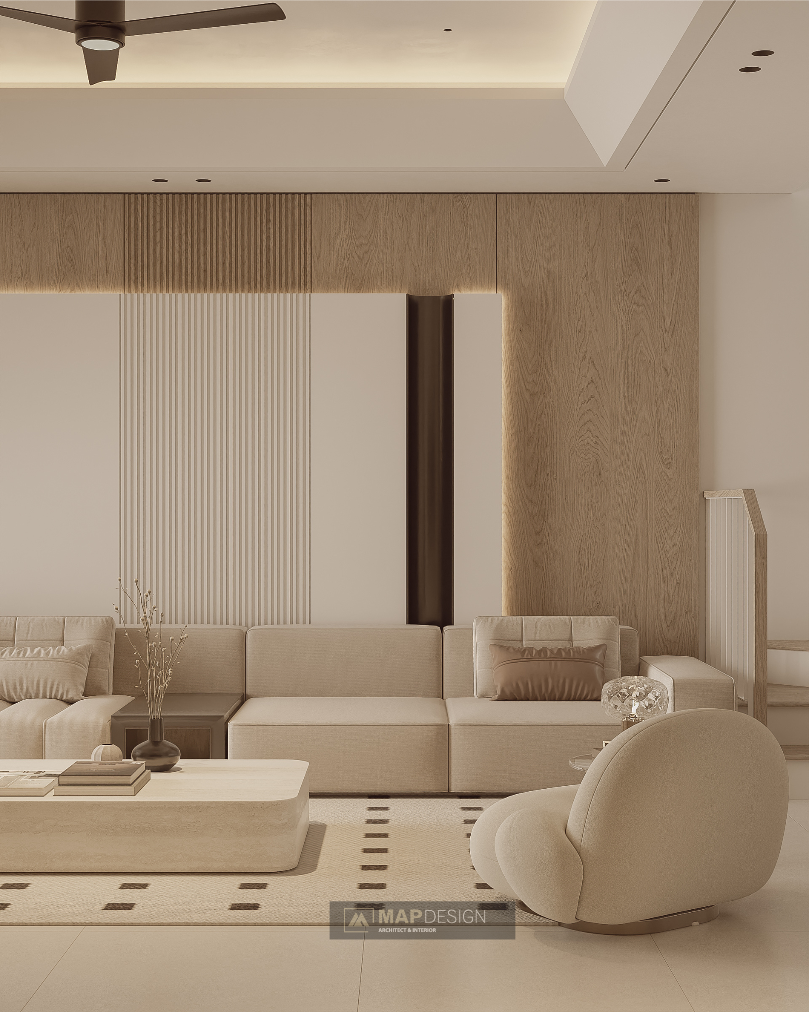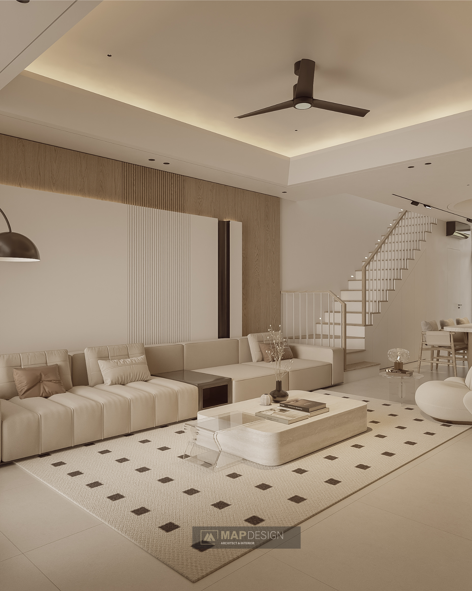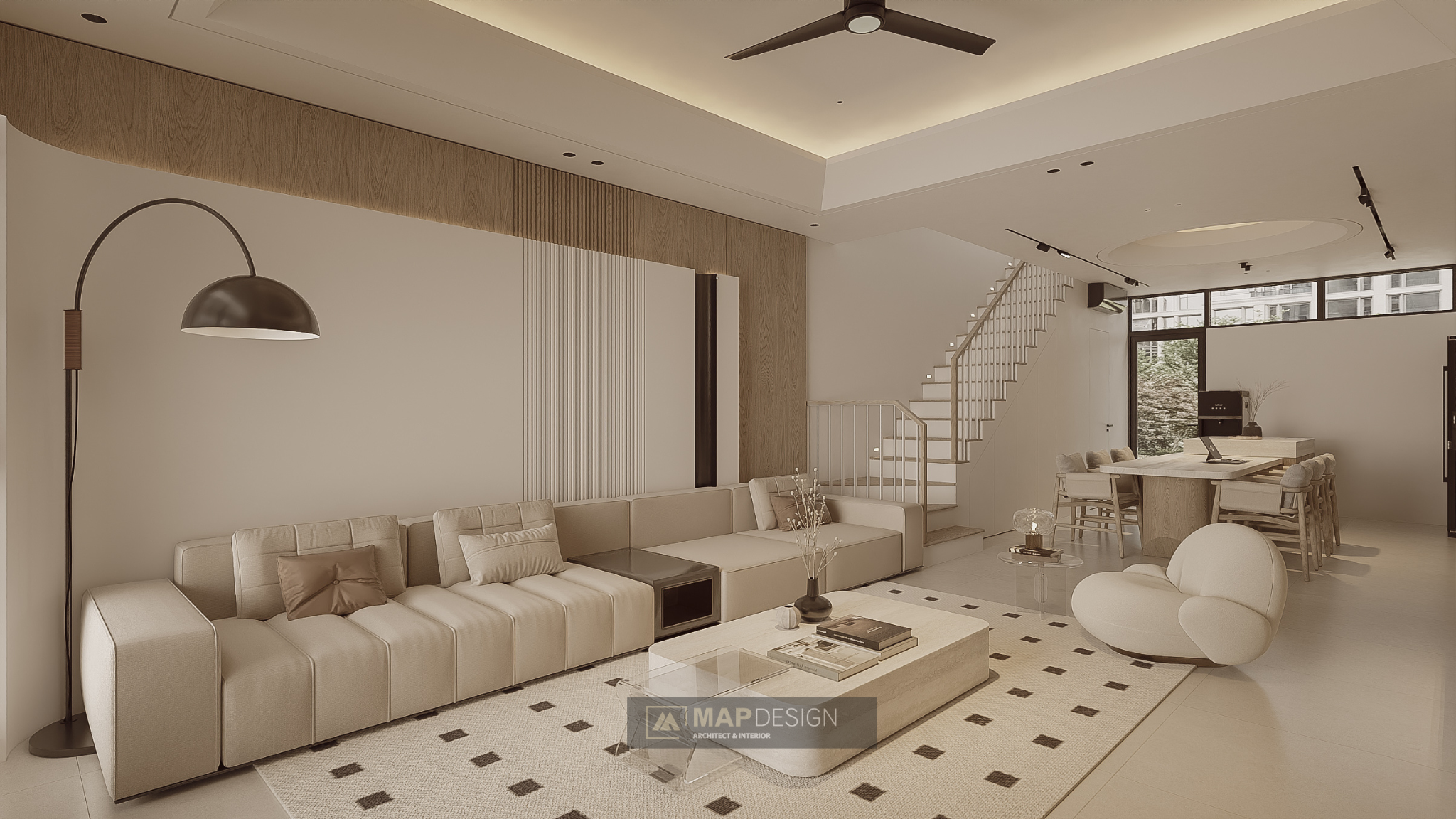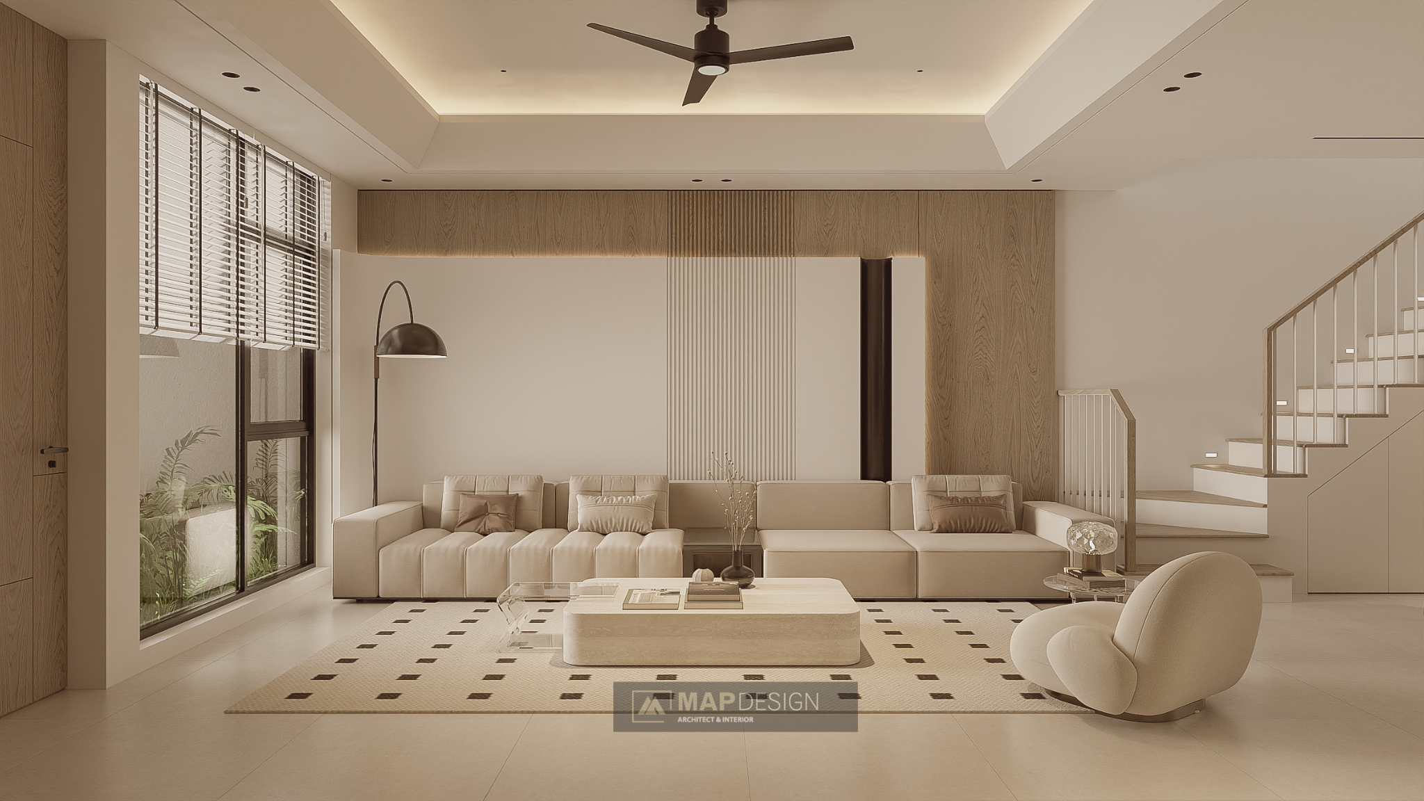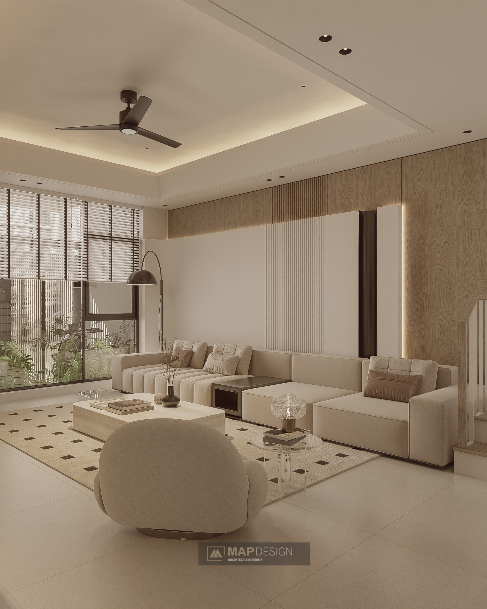 Mặt tiền ngôi nhà nổi bật với thiết kế hiện đại, kết hợp các mảng khối kiến trúc mạnh mẽ và vật liệu kính tạo cảm giác thoáng đãng. Được thiết kế với tông màu be chủ đạo, mang lại cảm giác ấm cúng và sang trọng. Đặc biệt, trần nhà giật cấp kết hợp đèn trần và đèn hắt tạo hiệu ứng ánh sáng đẹp mắt.