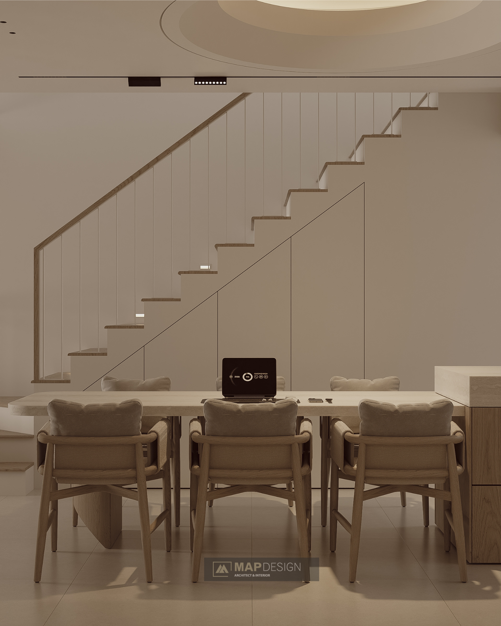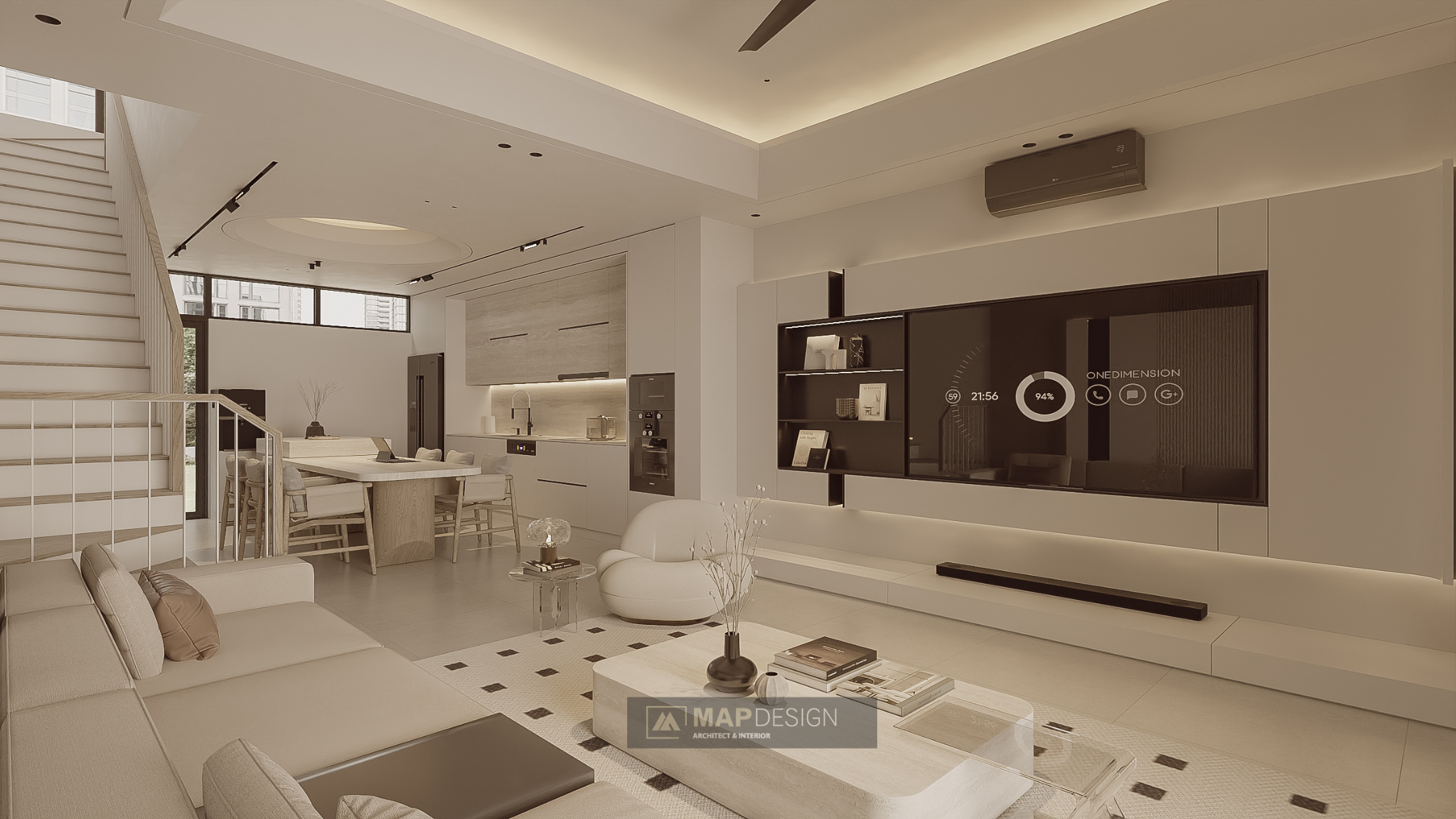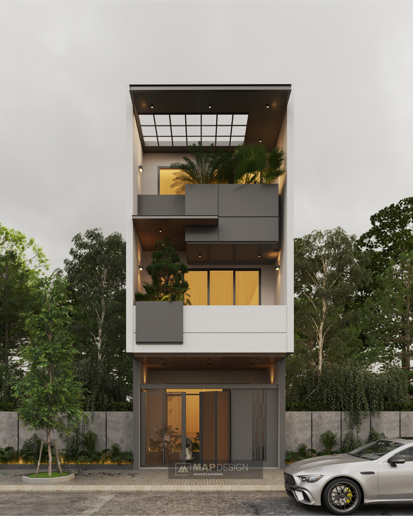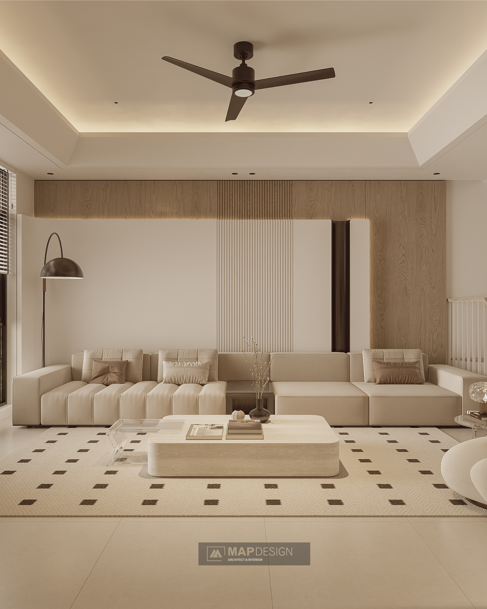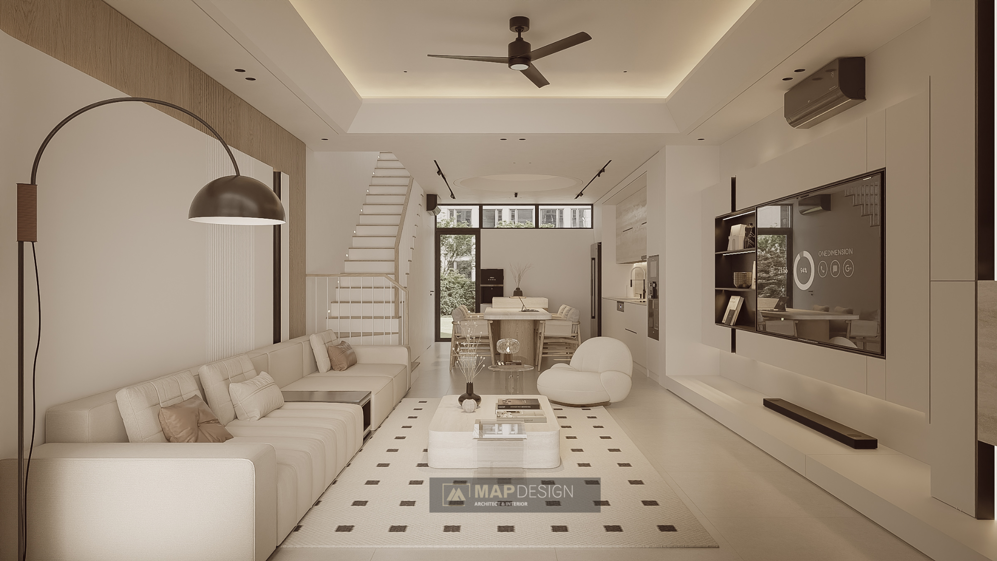 Mặt tiền ngôi nhà nổi bật với thiết kế hiện đại, kết hợp các mảng khối kiến trúc mạnh mẽ và vật liệu kính tạo cảm giác thoáng đãng. Được thiết kế với tông màu be chủ đạo, mang lại cảm giác ấm cúng và sang trọng. Đặc biệt, trần nhà giật cấp kết hợp đèn trần và đèn hắt tạo hiệu ứng ánh sáng đẹp mắt.