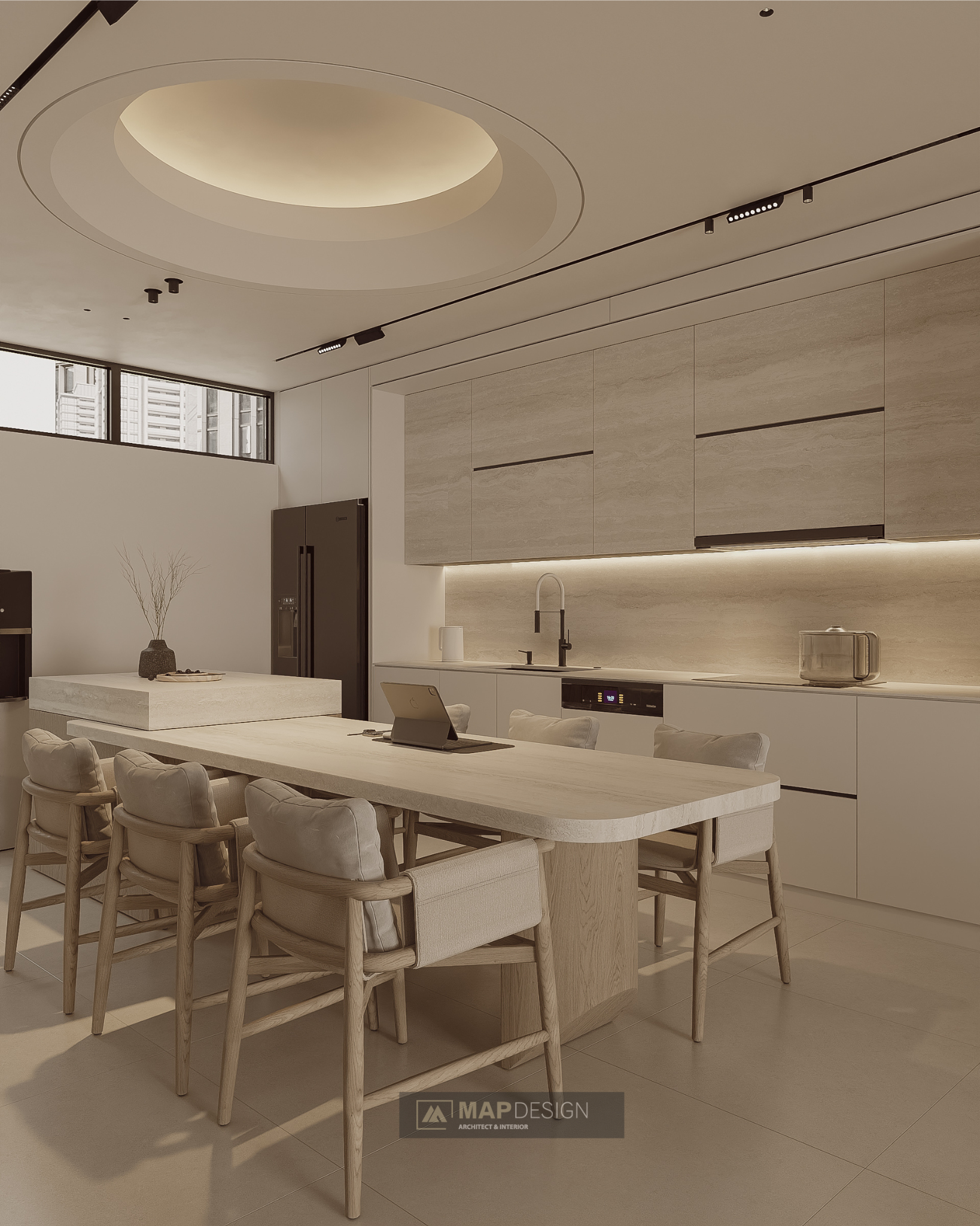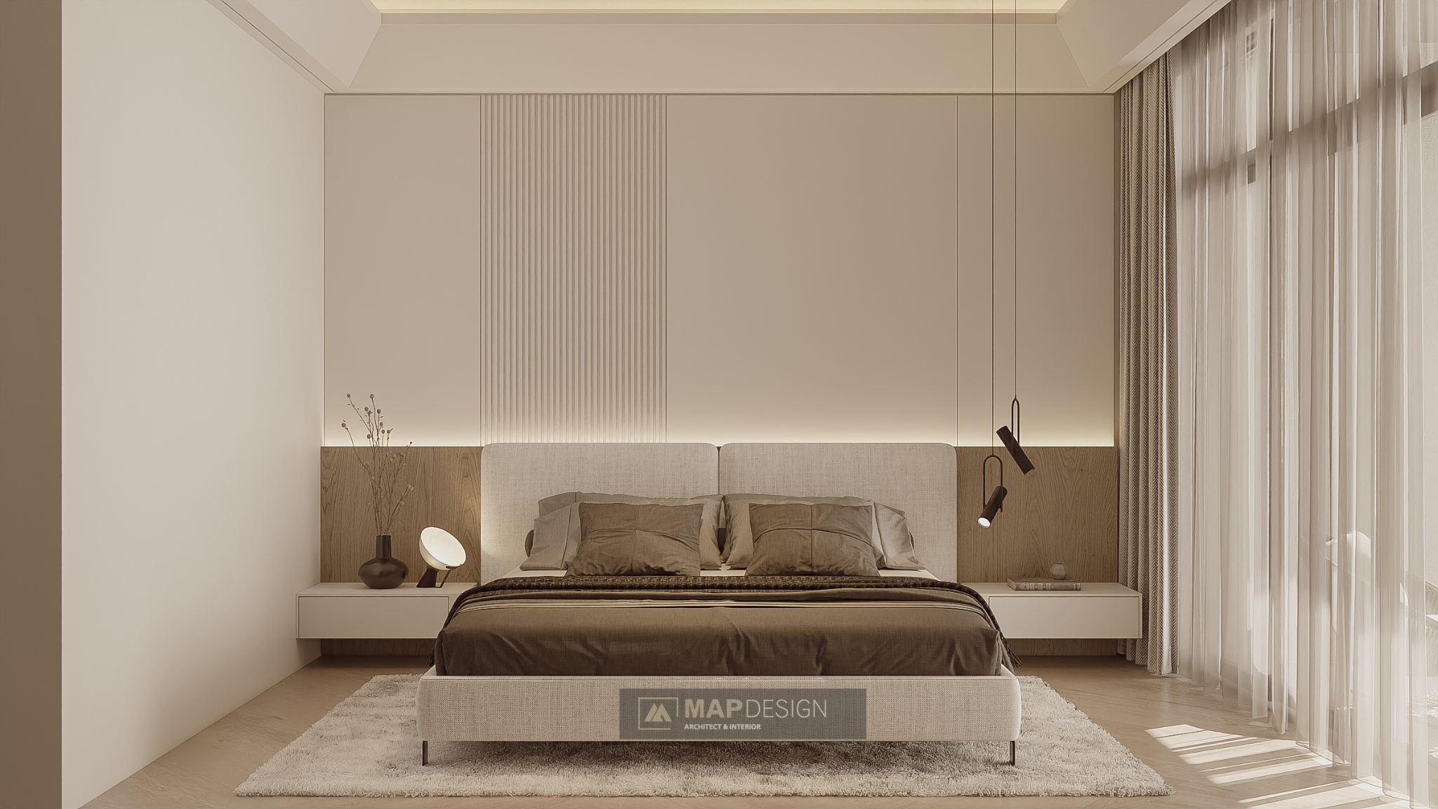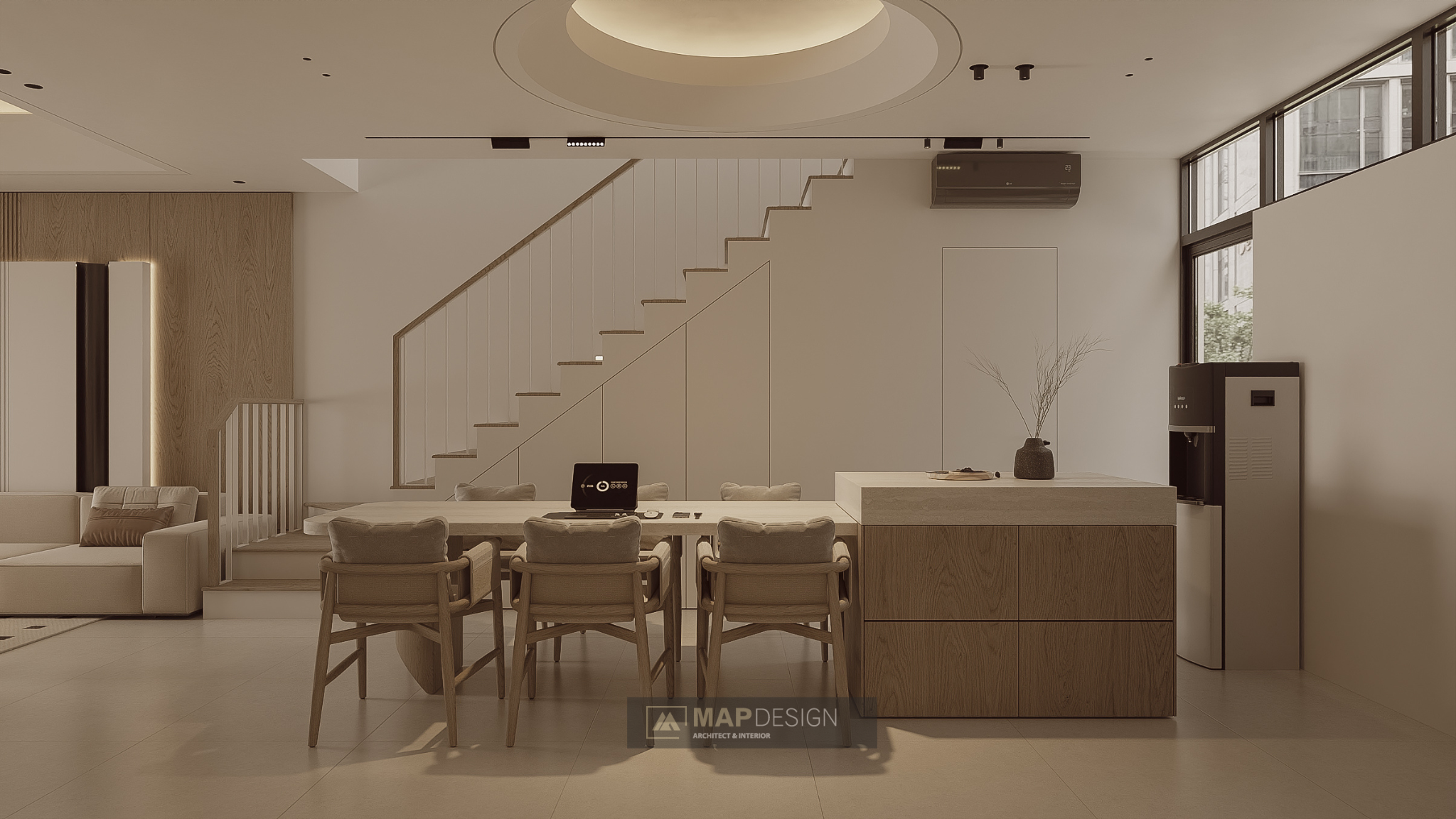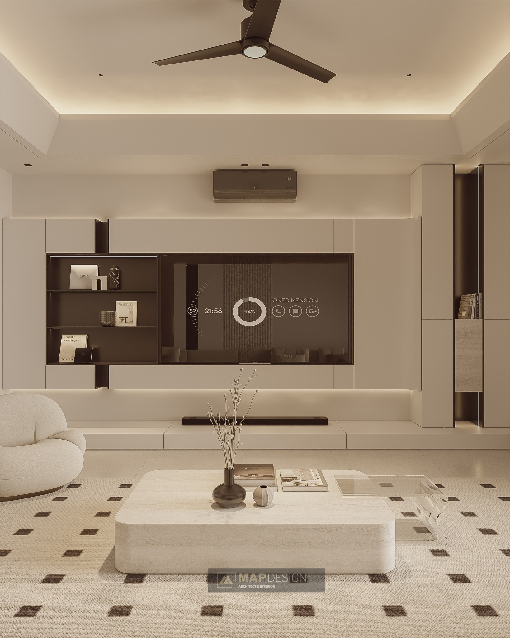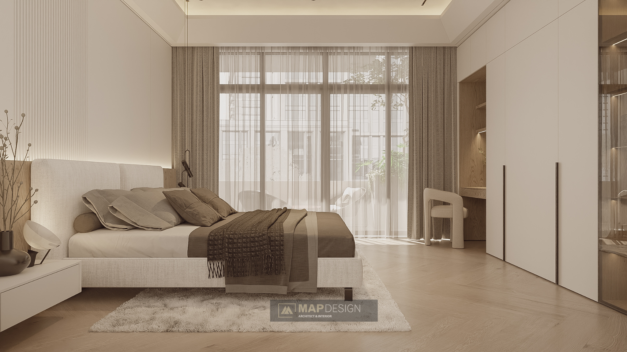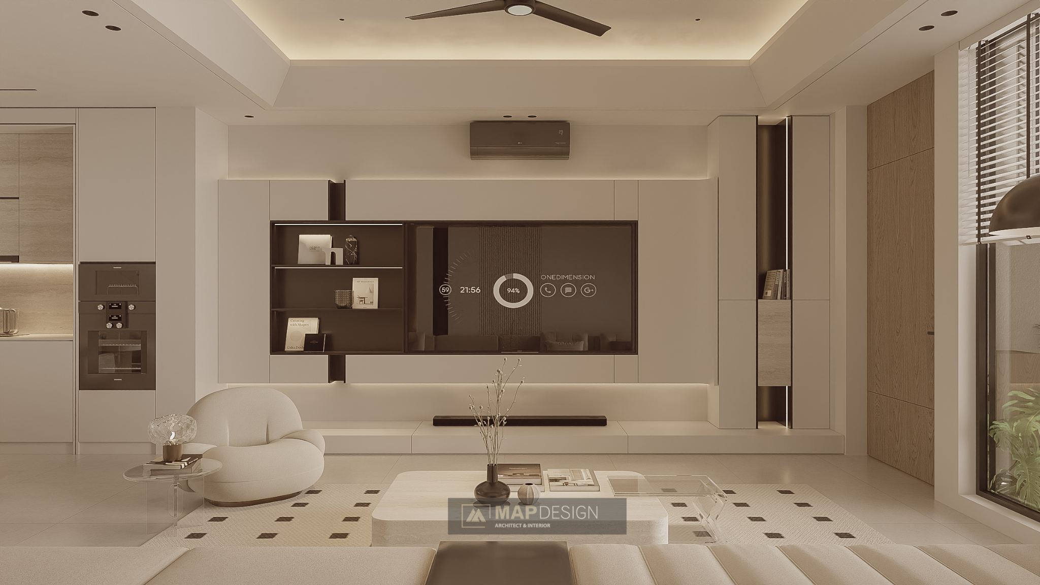 Mặt tiền ngôi nhà nổi bật với thiết kế hiện đại, kết hợp các mảng khối kiến trúc mạnh mẽ và vật liệu kính tạo cảm giác thoáng đãng. Được thiết kế với tông màu be chủ đạo, mang lại cảm giác ấm cúng và sang trọng. Đặc biệt, trần nhà giật cấp kết hợp đèn trần và đèn hắt tạo hiệu ứng ánh sáng đẹp mắt.