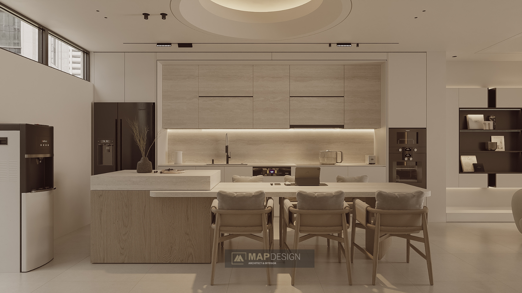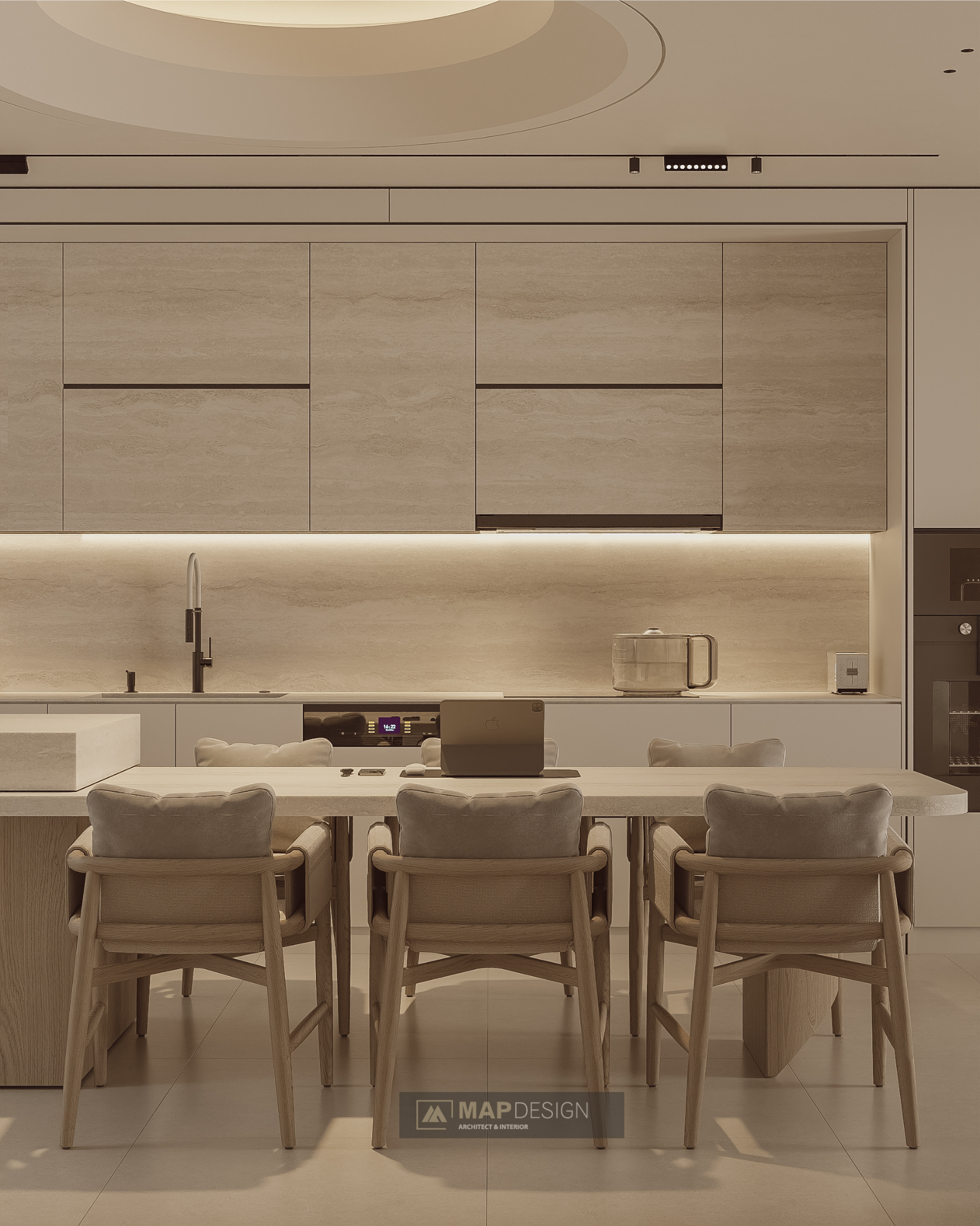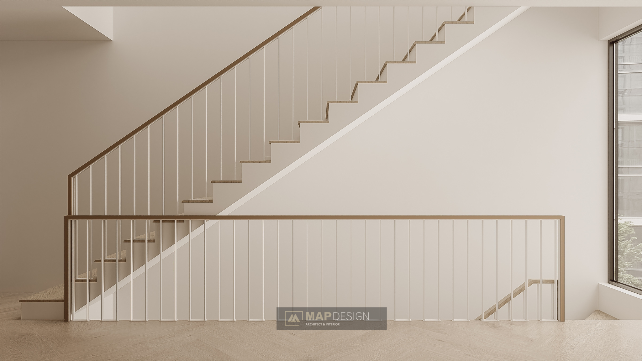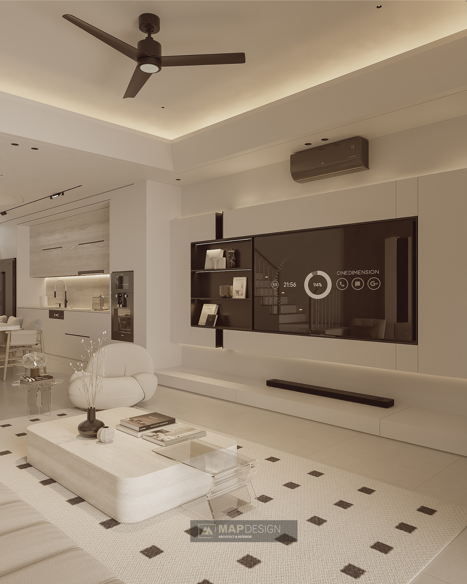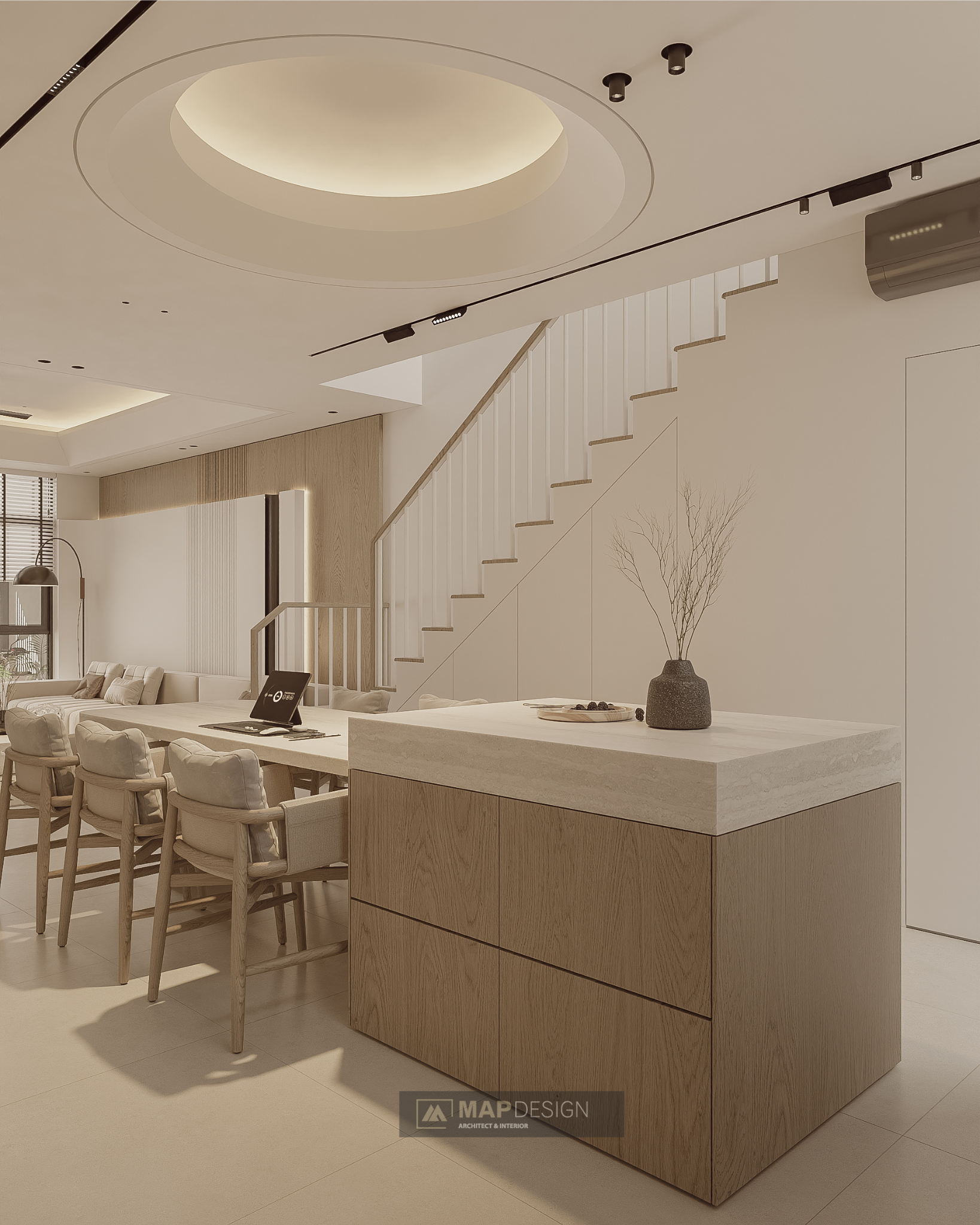 Mặt tiền ngôi nhà nổi bật với thiết kế hiện đại, kết hợp các mảng khối kiến trúc mạnh mẽ và vật liệu kính tạo cảm giác thoáng đãng. Được thiết kế với tông màu be chủ đạo, mang lại cảm giác ấm cúng và sang trọng. Đặc biệt, trần nhà giật cấp kết hợp đèn trần và đèn hắt tạo hiệu ứng ánh sáng đẹp mắt.