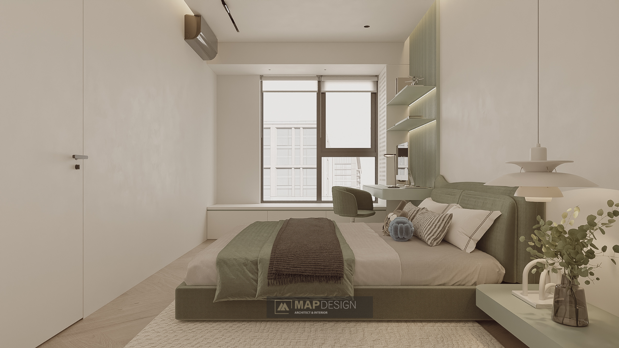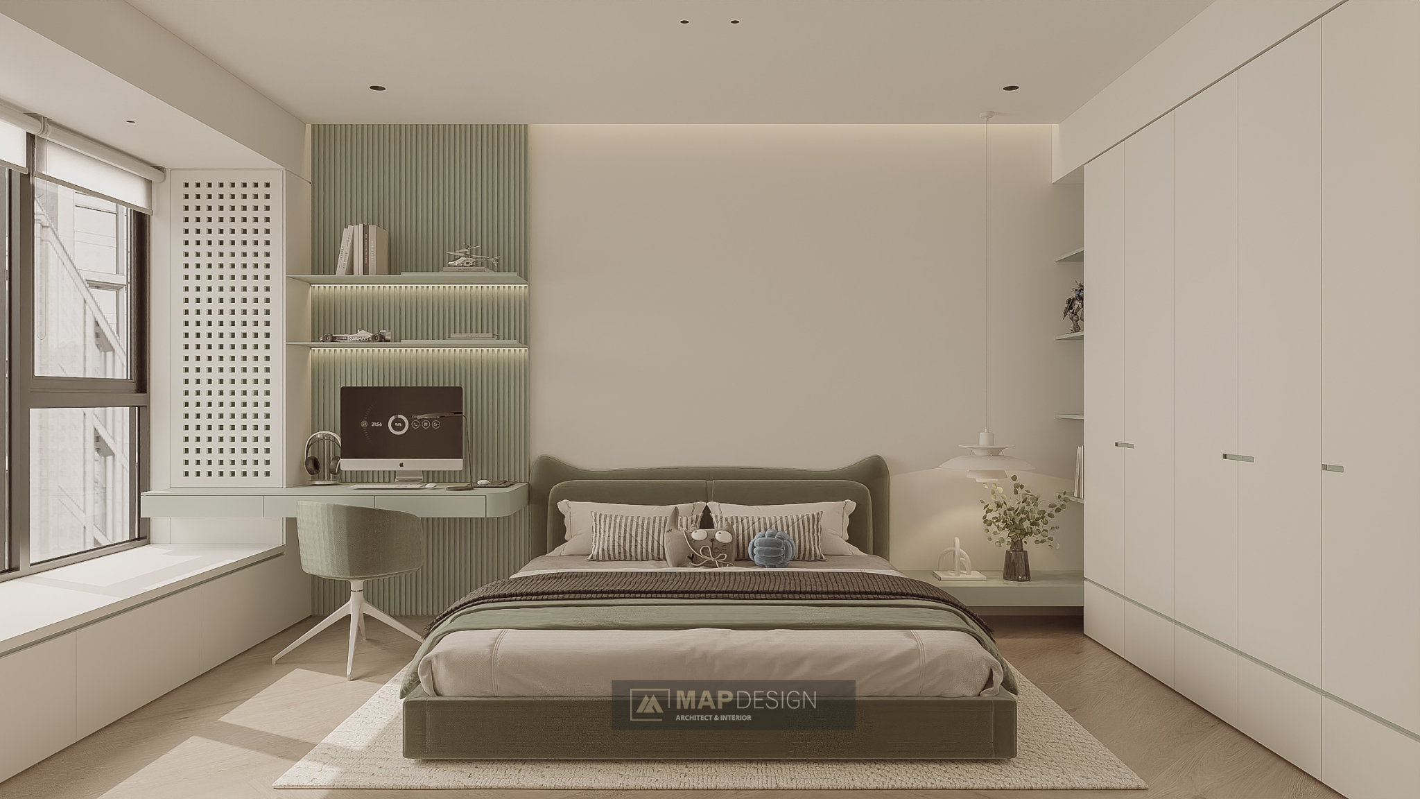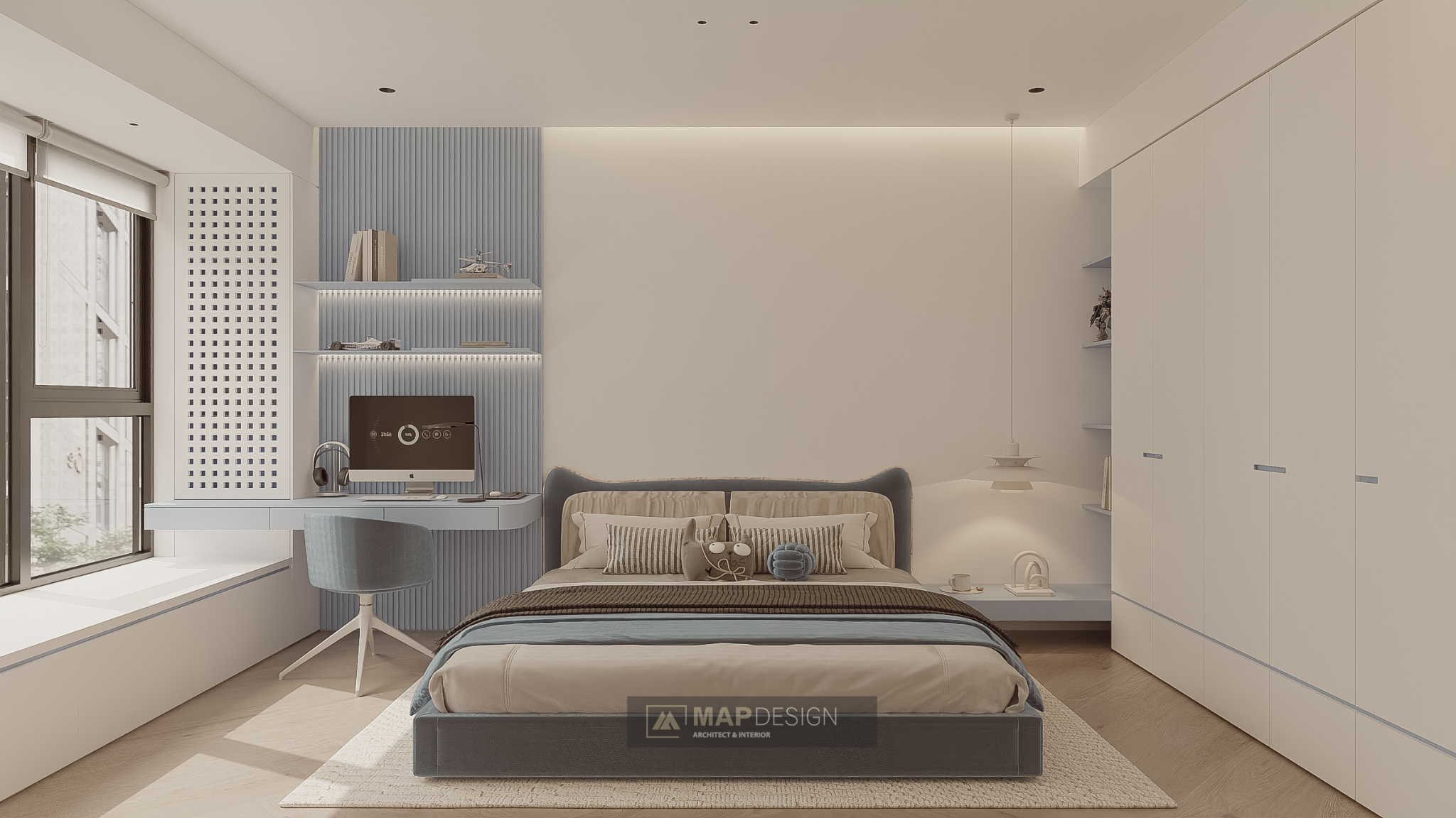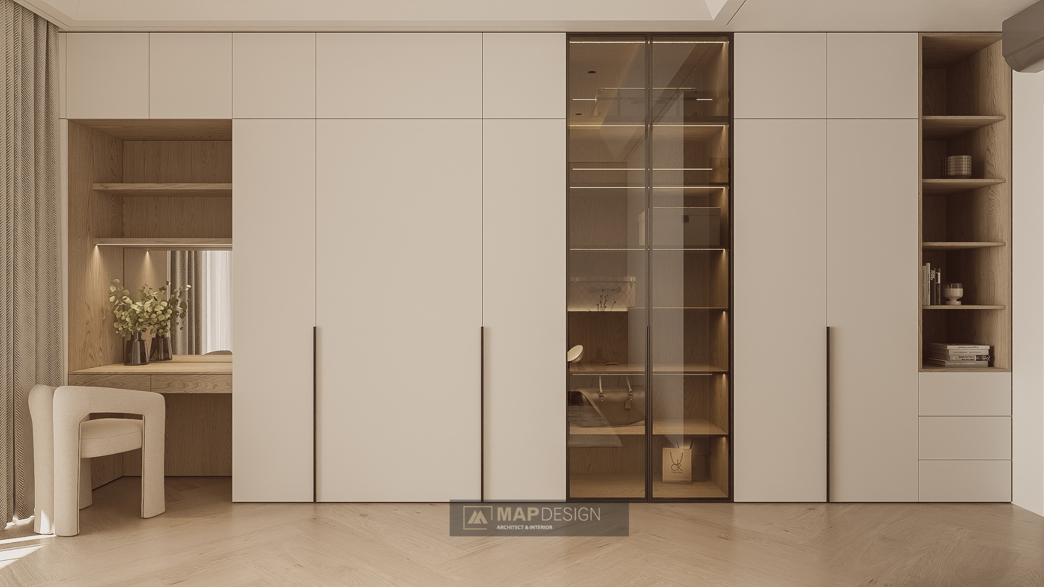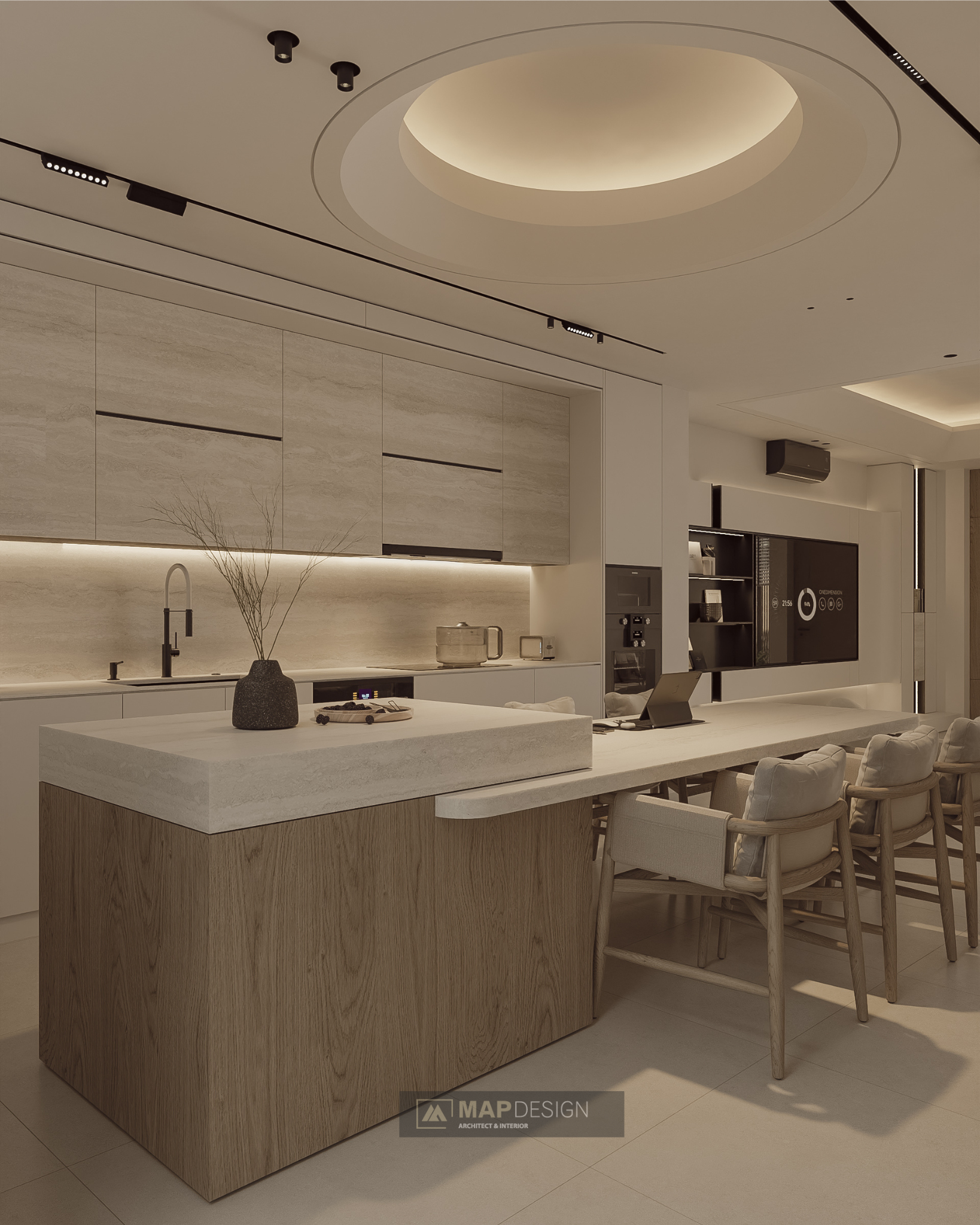 Mặt tiền ngôi nhà nổi bật với thiết kế hiện đại, kết hợp các mảng khối kiến trúc mạnh mẽ và vật liệu kính tạo cảm giác thoáng đãng. Được thiết kế với tông màu be chủ đạo, mang lại cảm giác ấm cúng và sang trọng. Đặc biệt, trần nhà giật cấp kết hợp đèn trần và đèn hắt tạo hiệu ứng ánh sáng đẹp mắt.