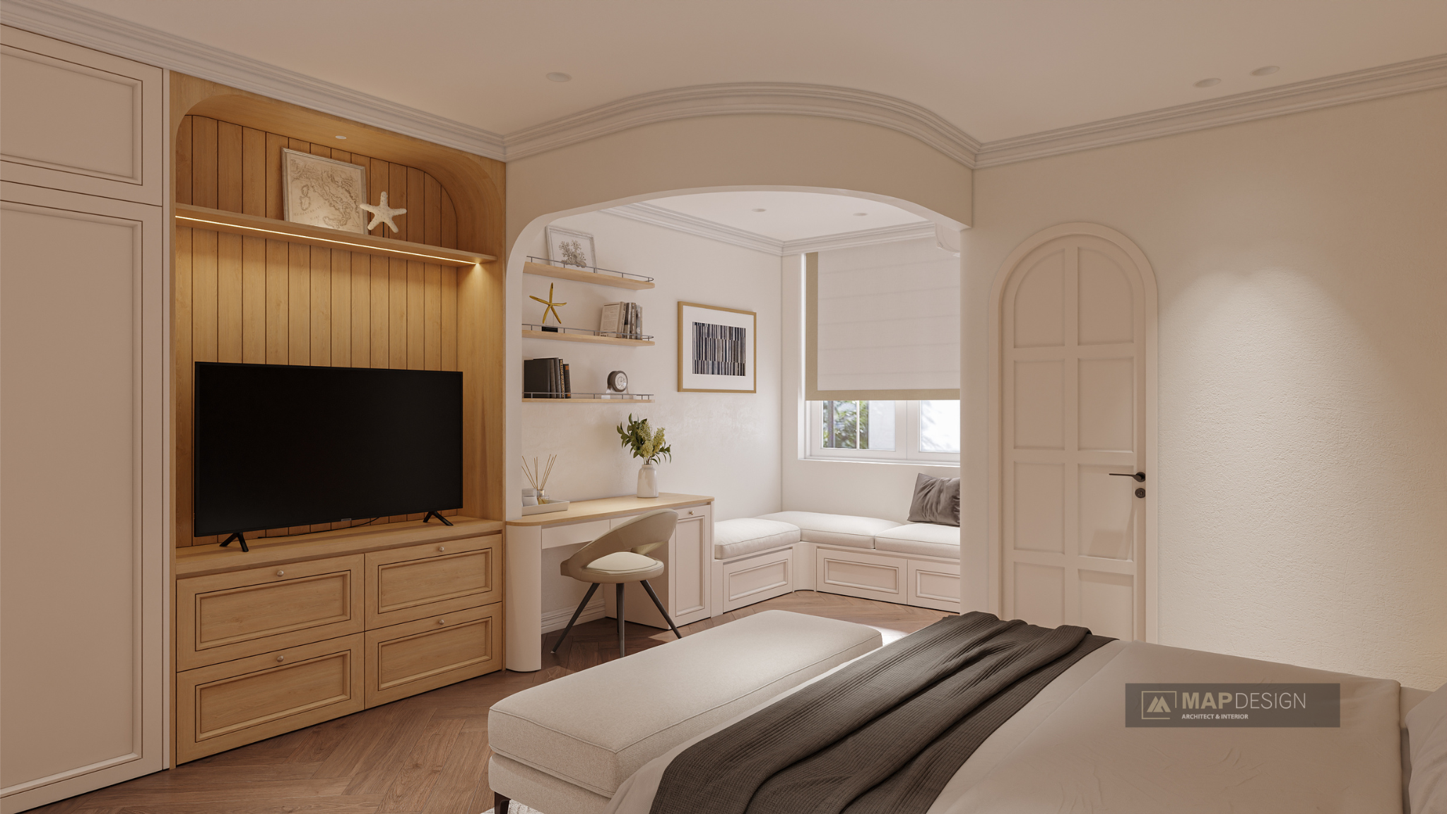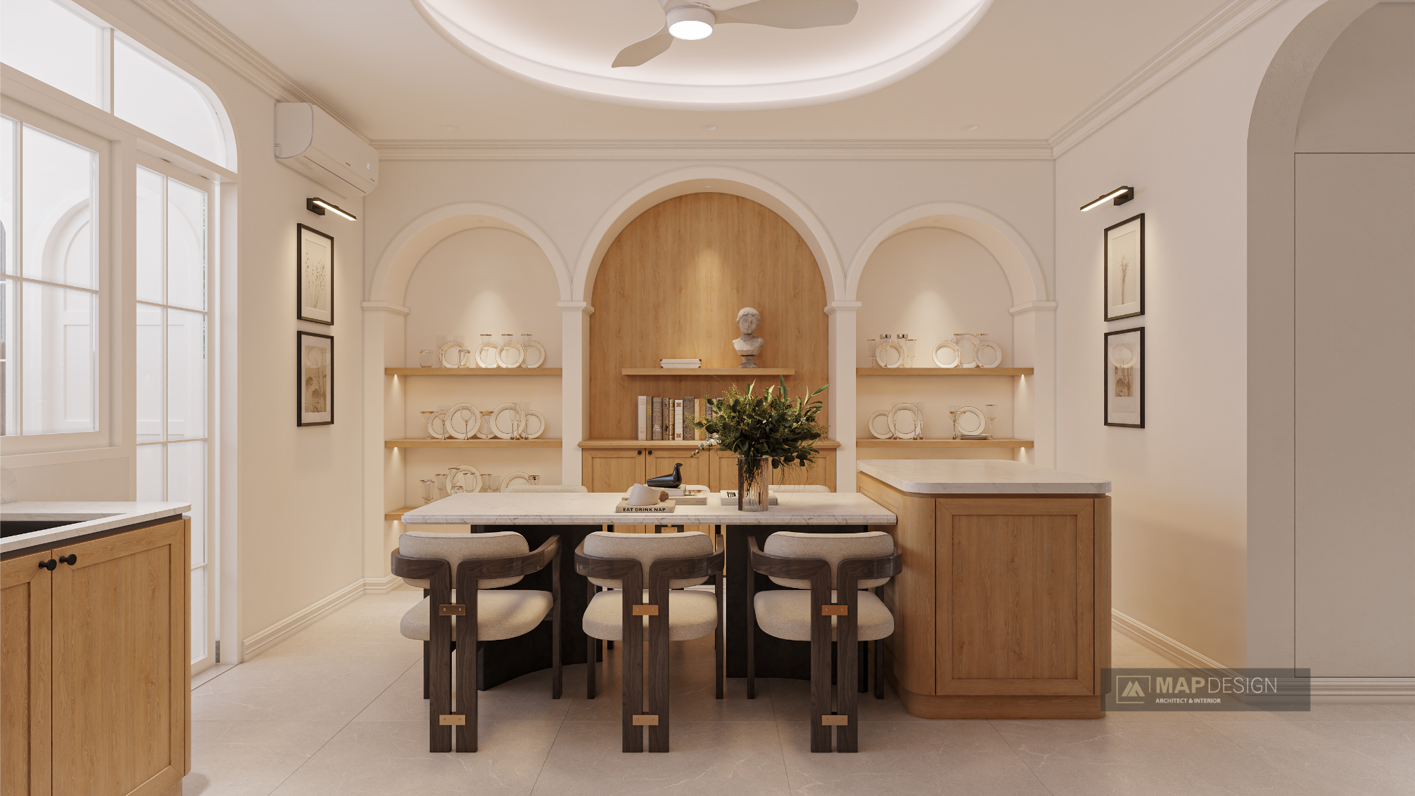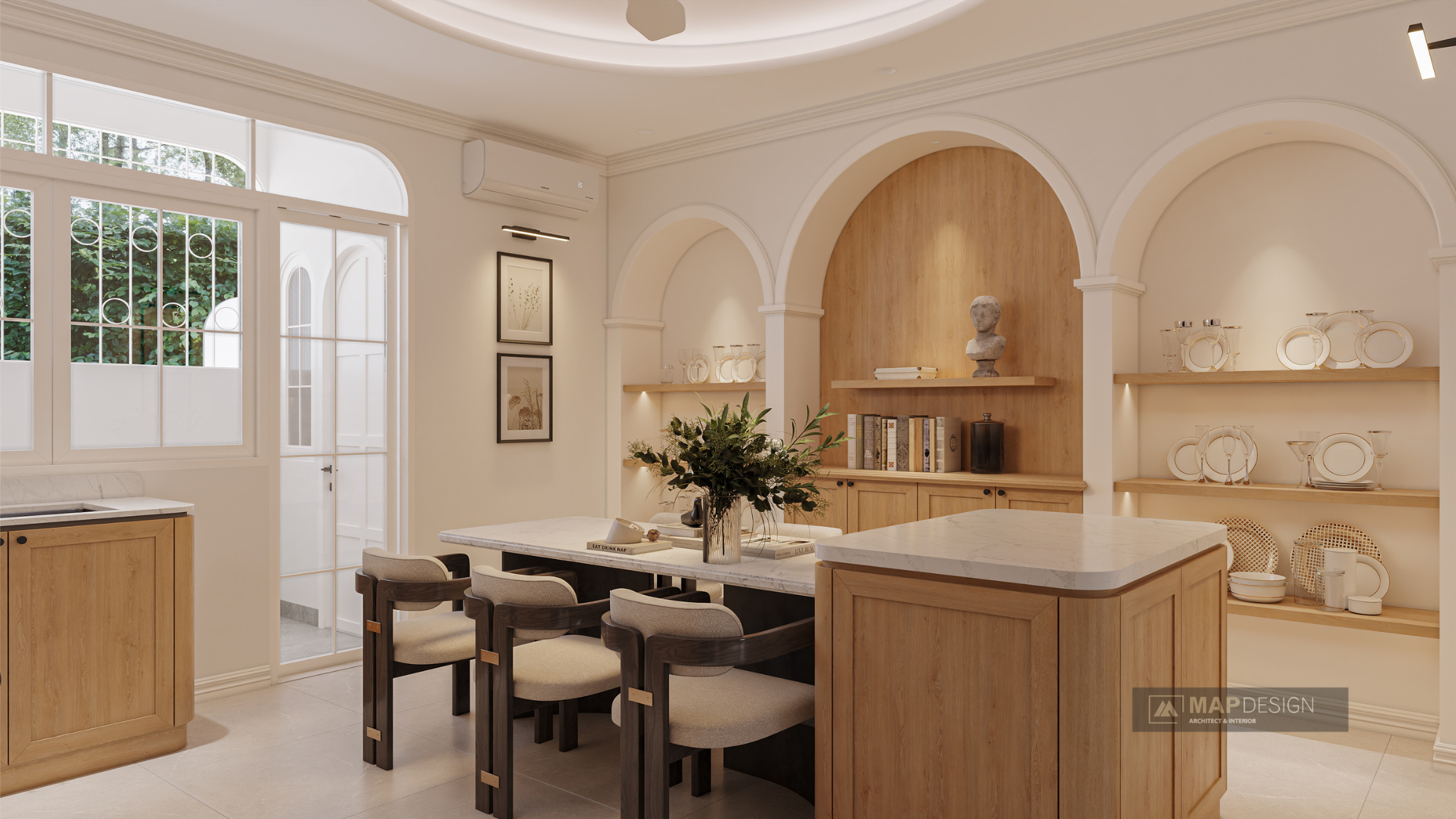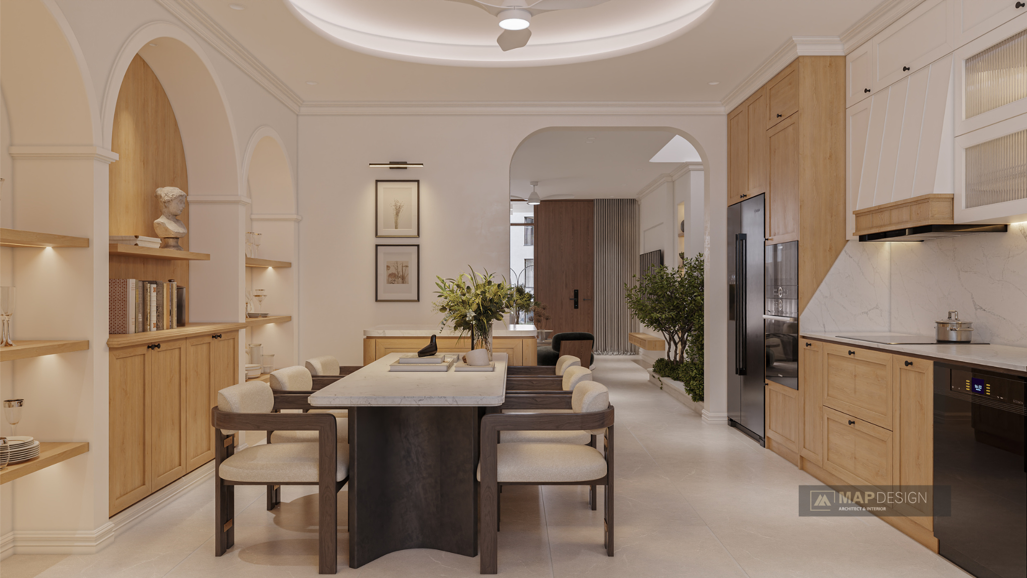 Căn nhà không chỉ là một công trình kiến trúc, mà là sự giao thoa tuyệt vời giữa nét mềm mại của những đường vòm cao vút và hơi thở hiện đại đầy sang trọng. Từ phòng khách khoáng đạt cho đến gian bếp ấm cúng, mọi chi tiết đều được chăm chút tỉ mỉ để tạo nên một tổ ấm vừa tiện nghi, vừa mang đậm dấu ấn cá nhân